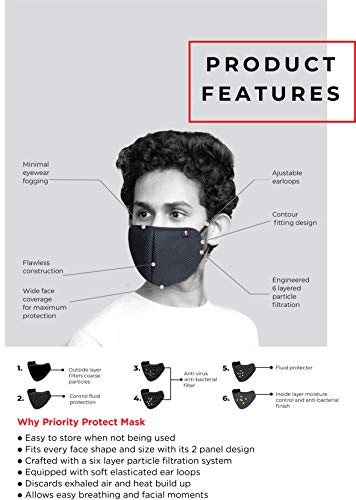 Priority’s Protect Mask is engineered with a 6 layer filtration system. First Filtration Layer helps to filter coarser unwanted particles, Middle Filtration Layer is of spun and melt blown which works as bacteria & small particles filter & prevent any bacteria sized 0.3 micron, Last Filtration layer is a cotton and has an anti-bacterial feature.